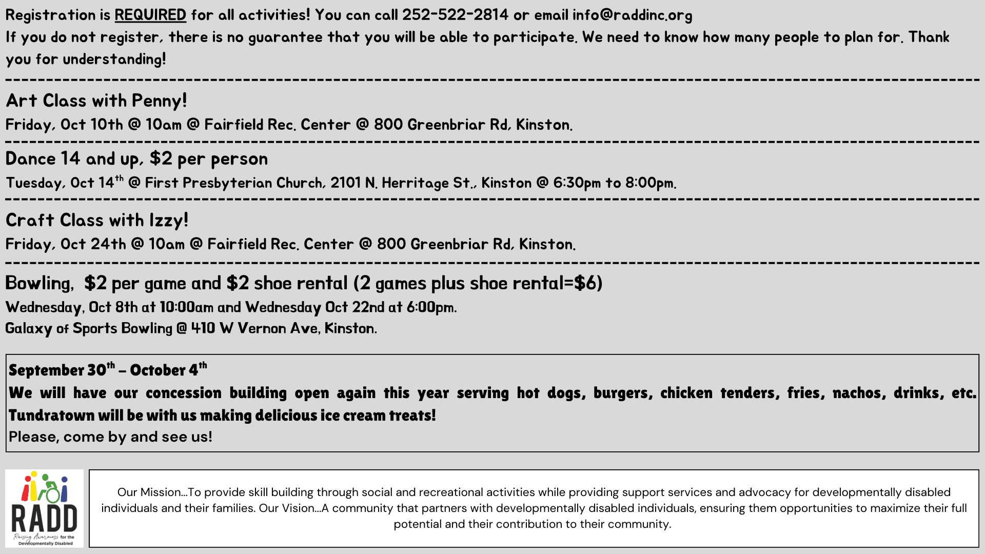 National Night Out (NNO) is an annual community event that promotes strong partnerships between law enforcement and the community we serve. Held on October 6th, the evening brings neighbors, police, and community organizations together for fun, food, and safety awareness. Through activities, demonstrations, and positive interactions, National Night Out strengthens neighborhood spirit and highlights the importance of working together to keep Kinston safe. This is a free community event and it will be held at Emma Webb Park this year. RADD will be there, so should you!!! |